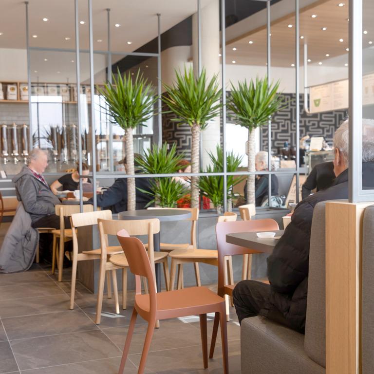 Rénovée en 2024, cette succursale possède maintenant un espace moderne avec un service au volant et des silos pour les cafés en vrac.